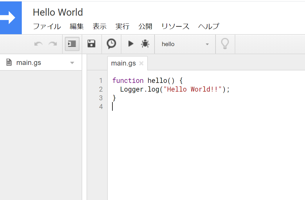 適当なエディタでmain.gsというファイルを作成し以下のように記載します。