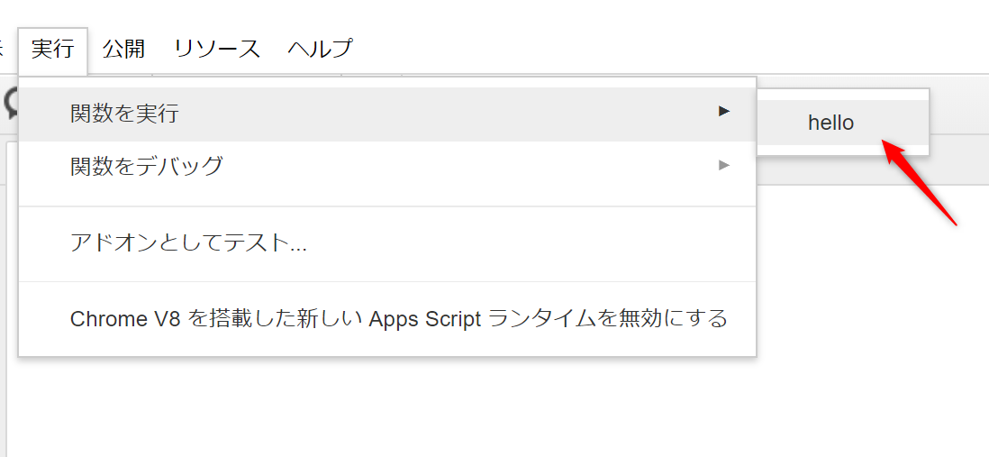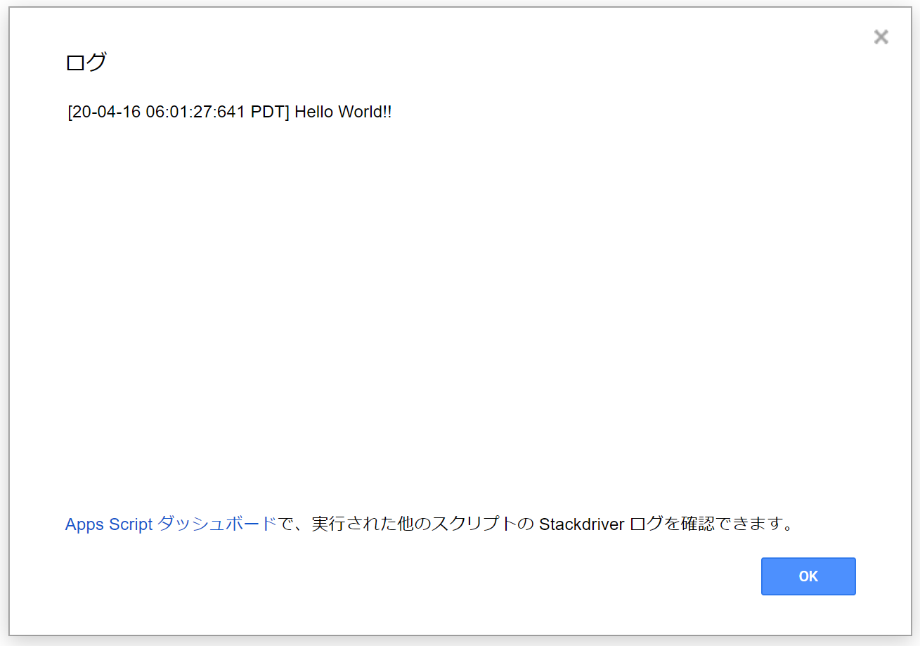 ここでGoogle Apps Scriptの自分のプロジェクトを開いてみるとHello Worldプロジェクトが作成されていると思います。