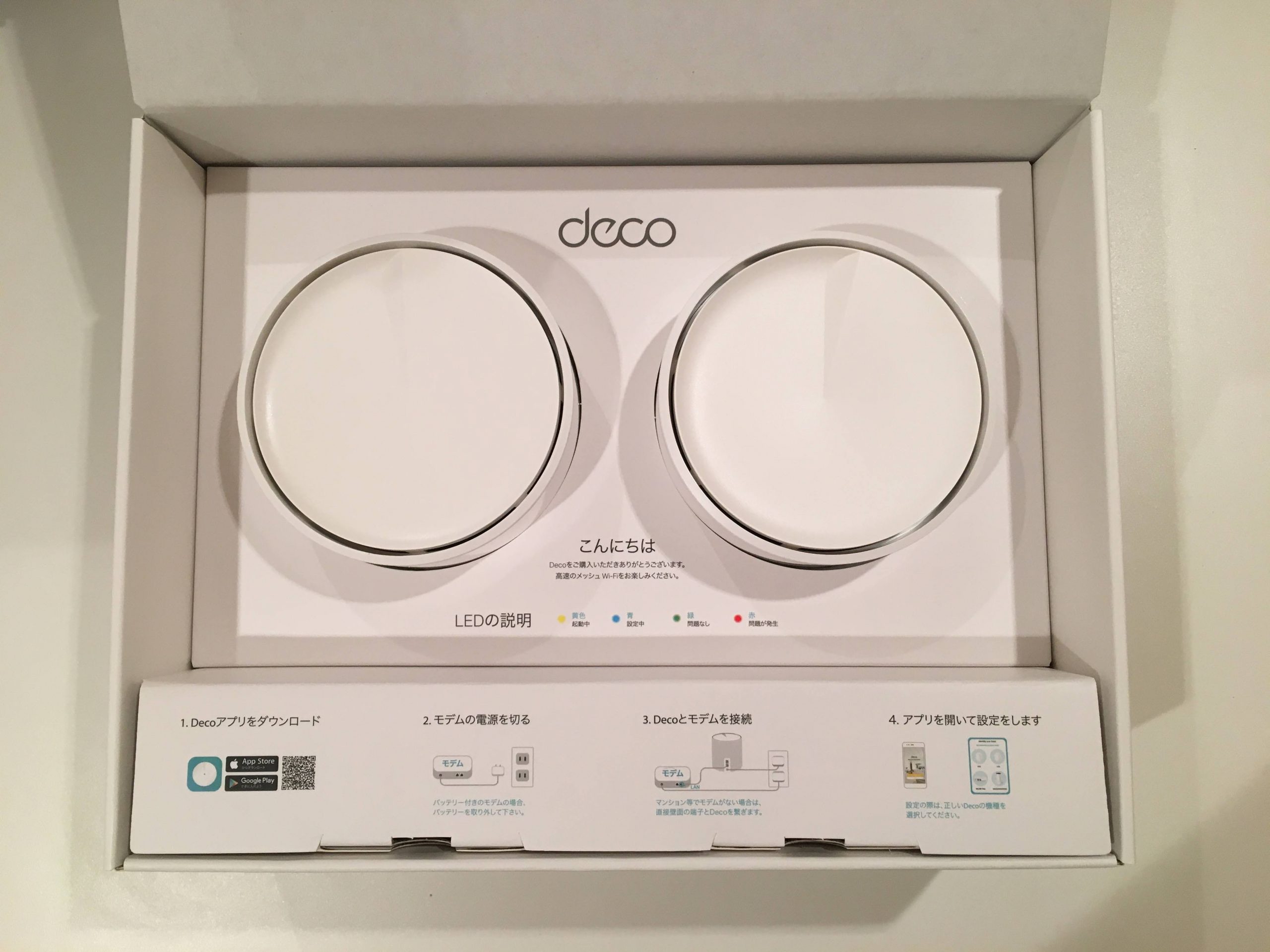 なので手順等は割愛します。いや本当に、電源入れる>しばらくするとLEDが緑になる>アプリで新しいDecoが追加されました。